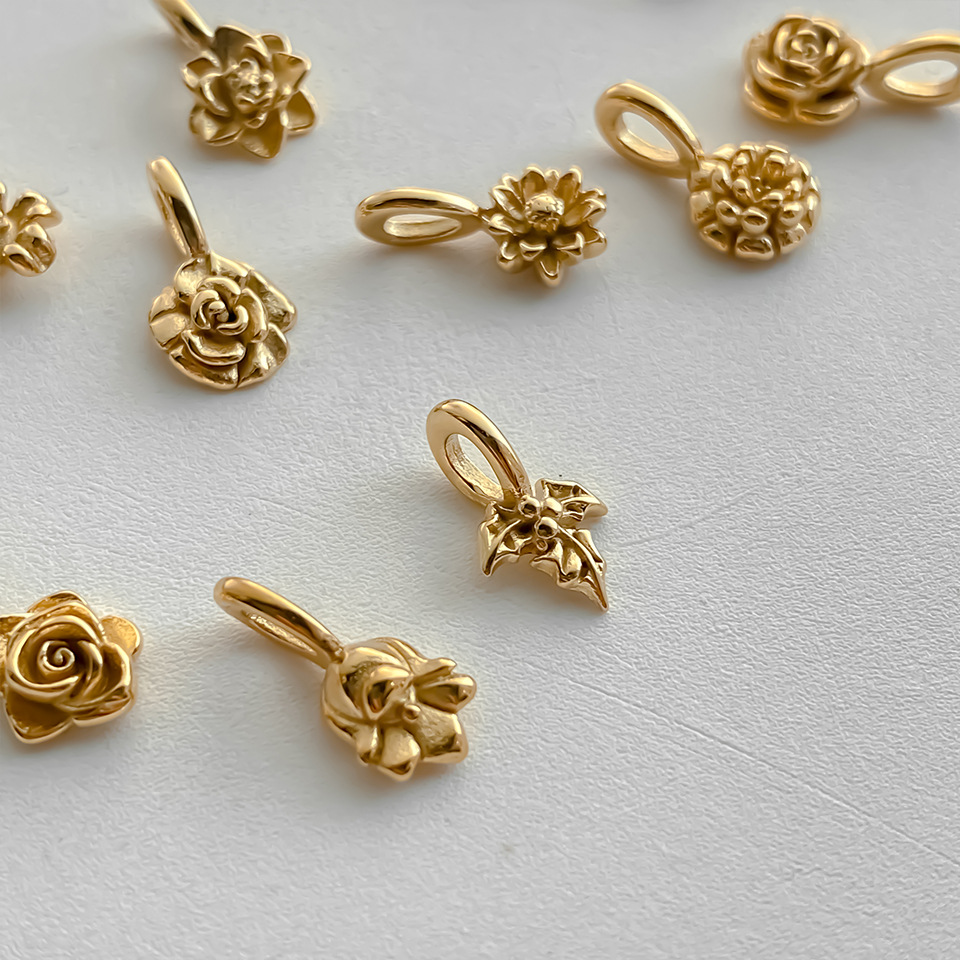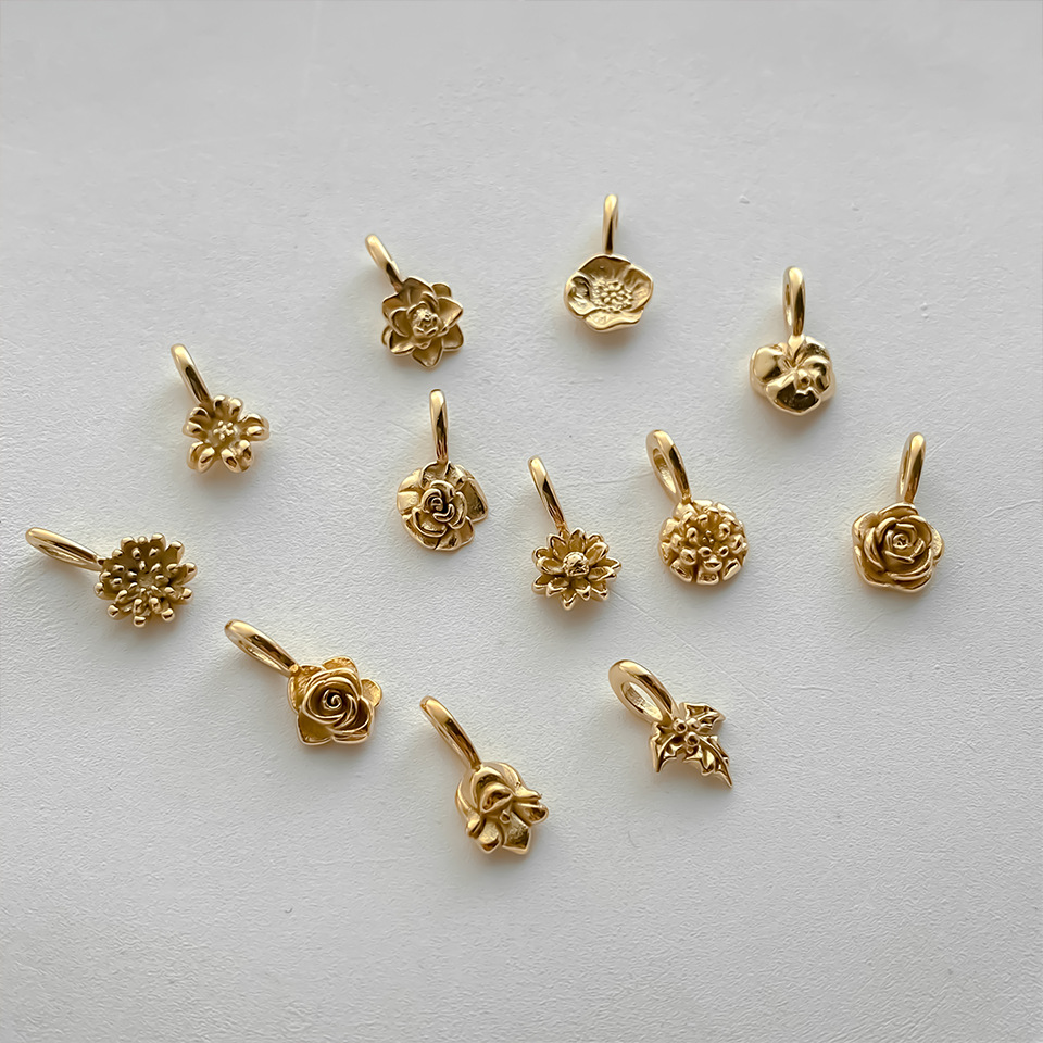 Colors: January Carnation—Gold, January Carnation—Steel, February Violet—Gold, February Violet—Steel, March Cherry Blossom—Gold, March Cherry Blossom—Steel, April Daisy—Gold, April Daisy—Steel, May Lily of the Valley—Gold, May Lily of the Valley—Steel, June Rose—Gold, June Rose—Steel, July Lotus—Gold, July Lotus—Steel, August Poppy—Gold, August Poppy—Steel, September Peony—Gold, September Peony—Steel, October Marigold—Gold, October Marigold—Steel, November Chrysanthemum—Gold, November Chrysanthemum—Steel, December Holly—Gold, December Holly—Steel